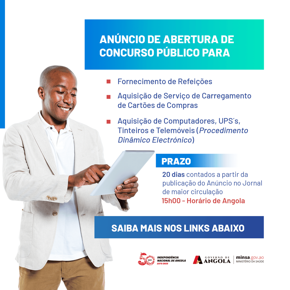 O Ministério da Saúde, vem tornar público, nos termos do disposto no n.° 1 do artigo 67.° e do Anexo IV da Lei n.° 41/20, de 23 de Dezembro - Lei dos Contratos Públicos, que está aberto o Concurso Público para: